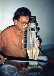Aguru Sarkar of Calcutta was one of a handful of non-hereditary players whom I met during my fieldwork between 1993 and 1998. A rare breed, he was from a middle-class background and chose to learn this difficult and stigmatised instrument from the great player, Ustad Sagiruddin Khan, one of the great accompanists of the 20th century. Although very few solo recordings of Sagiruddin Khan survive, because he was a staff artist, his sarangi can be heard on many recordings of vocal music from AIR, Kolkata. Sagiruddin had been a disciple of the peerless Bundu Khan. From Sagiruddin Khan Aguru Sarkar learnt some of Bundu Khan's unusual sitar-like fingering techniques, and also some limited use of the little finger and extraordinarily subtle bowing techniques which are demonstrated in the videos I made in the summer of 1996.