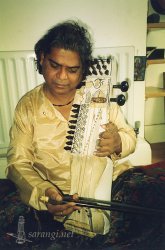 The late Ramesh Mishra was one of the most outstanding recent sarangi players of the Banaras gharana. For many years he lived mostly in New York, putting him out-of-play in the Indian market. His excellent accompaniment was missed, especially in Calcutta where he was born and lived most of his life. His sweet sarangi playing can be heard on many recordings of the great Girija Devi. His sarangi makes a very distinctive impression—painted with white gloss paint all over.